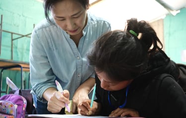 Las misioneras coreanas visitan escuelas públicas en aldeas rurales cada semana para impartir clases de música, inglés, arte y etc.